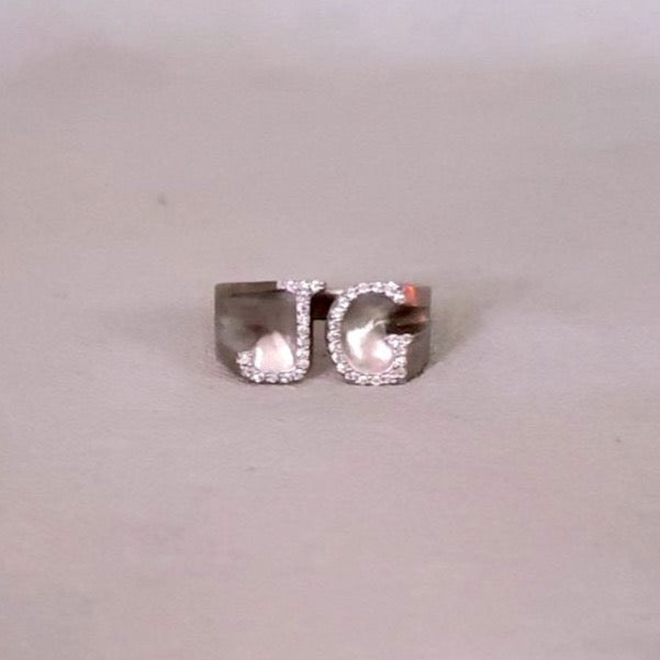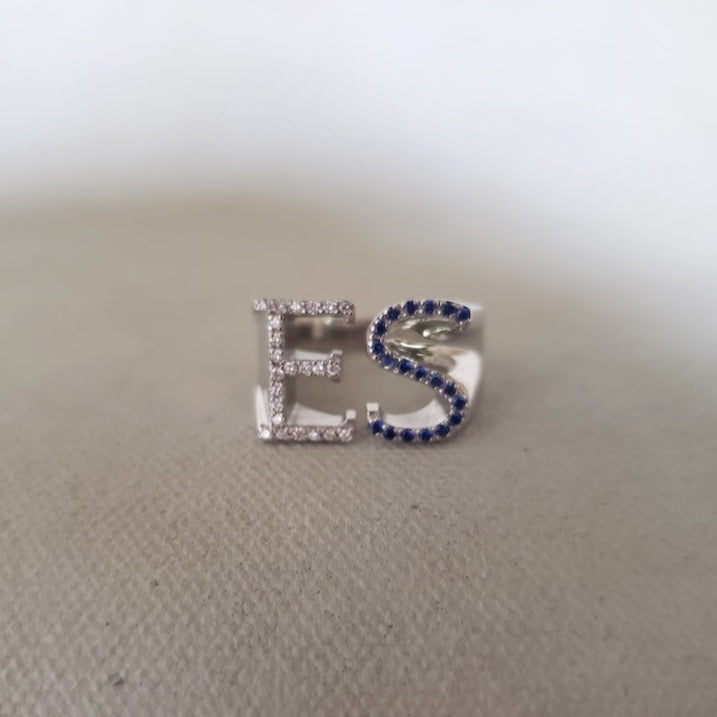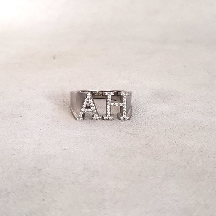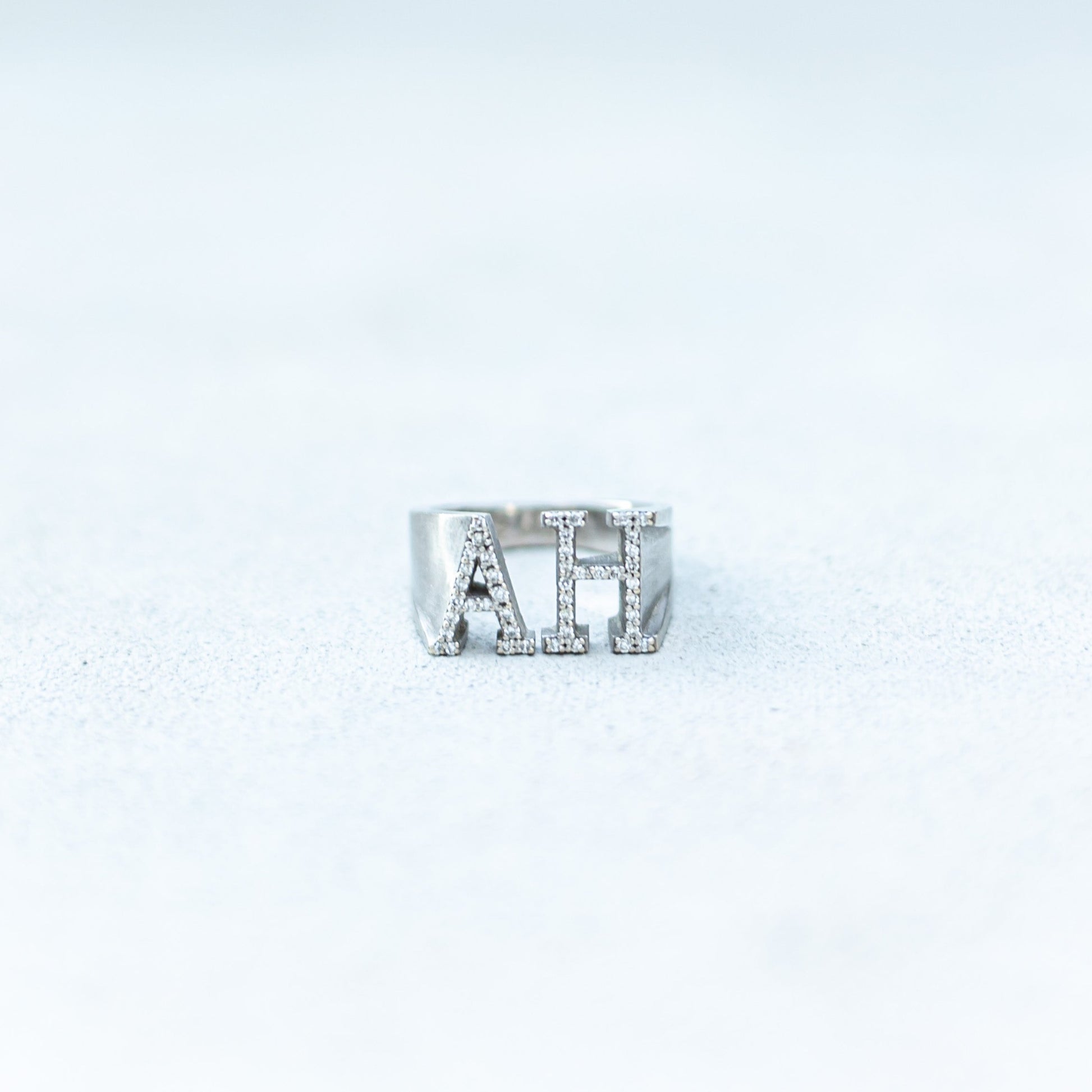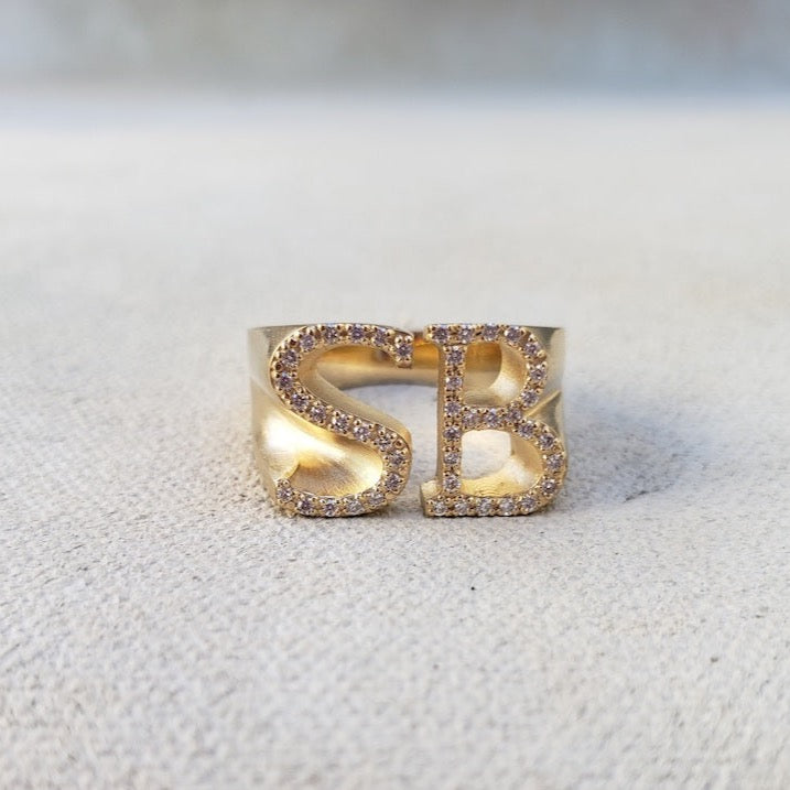 Custom at every step this initial ring involves a CAD drawing and a lost wax process. This ring is available in Sterling Silver, 14 Karat Gold, 14 Karat White Gold and 14 Karat Rose Gold encrusted in Pave Diamonds for a little extra bling. Enter your custom initials and any other requests in the box above.