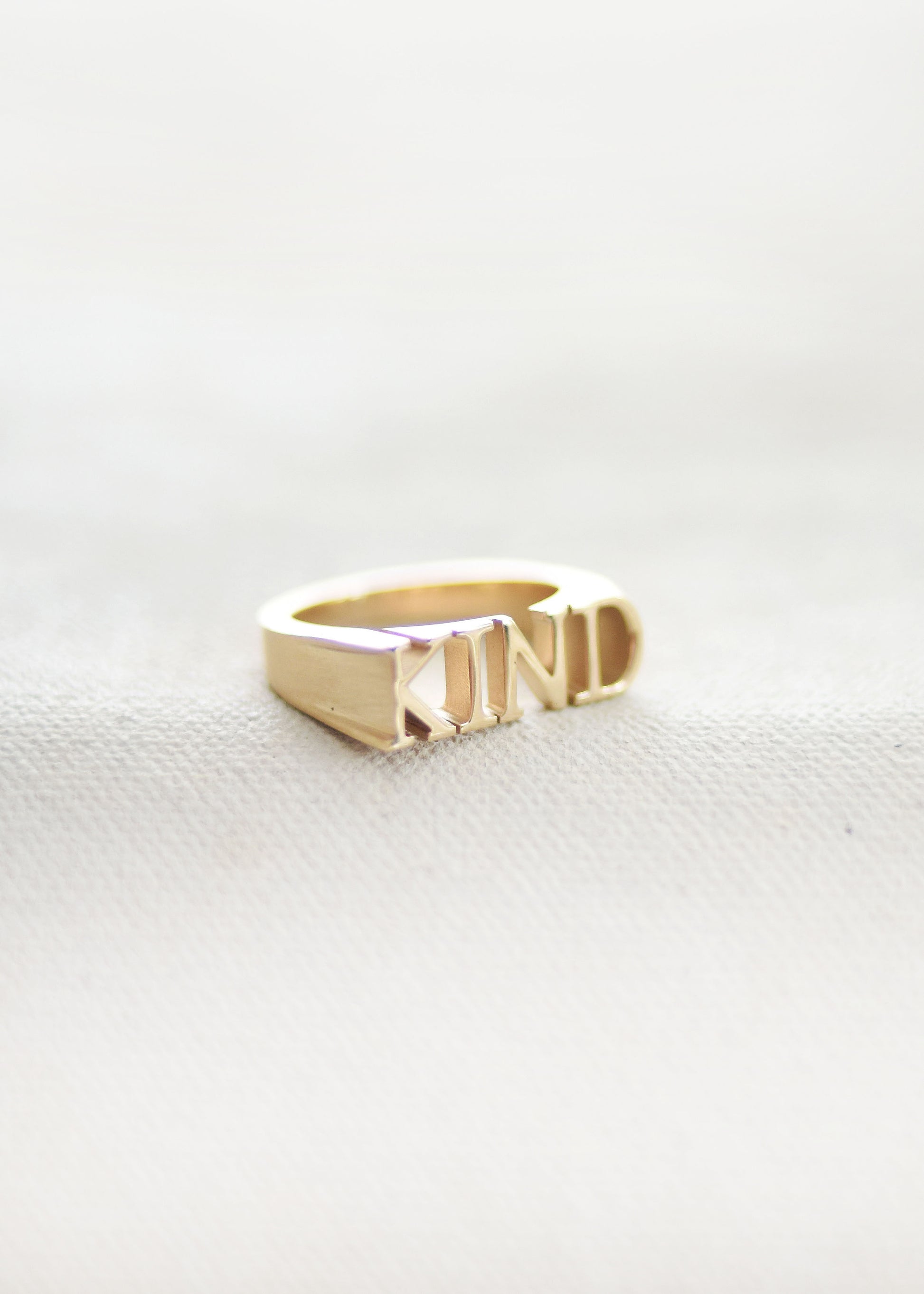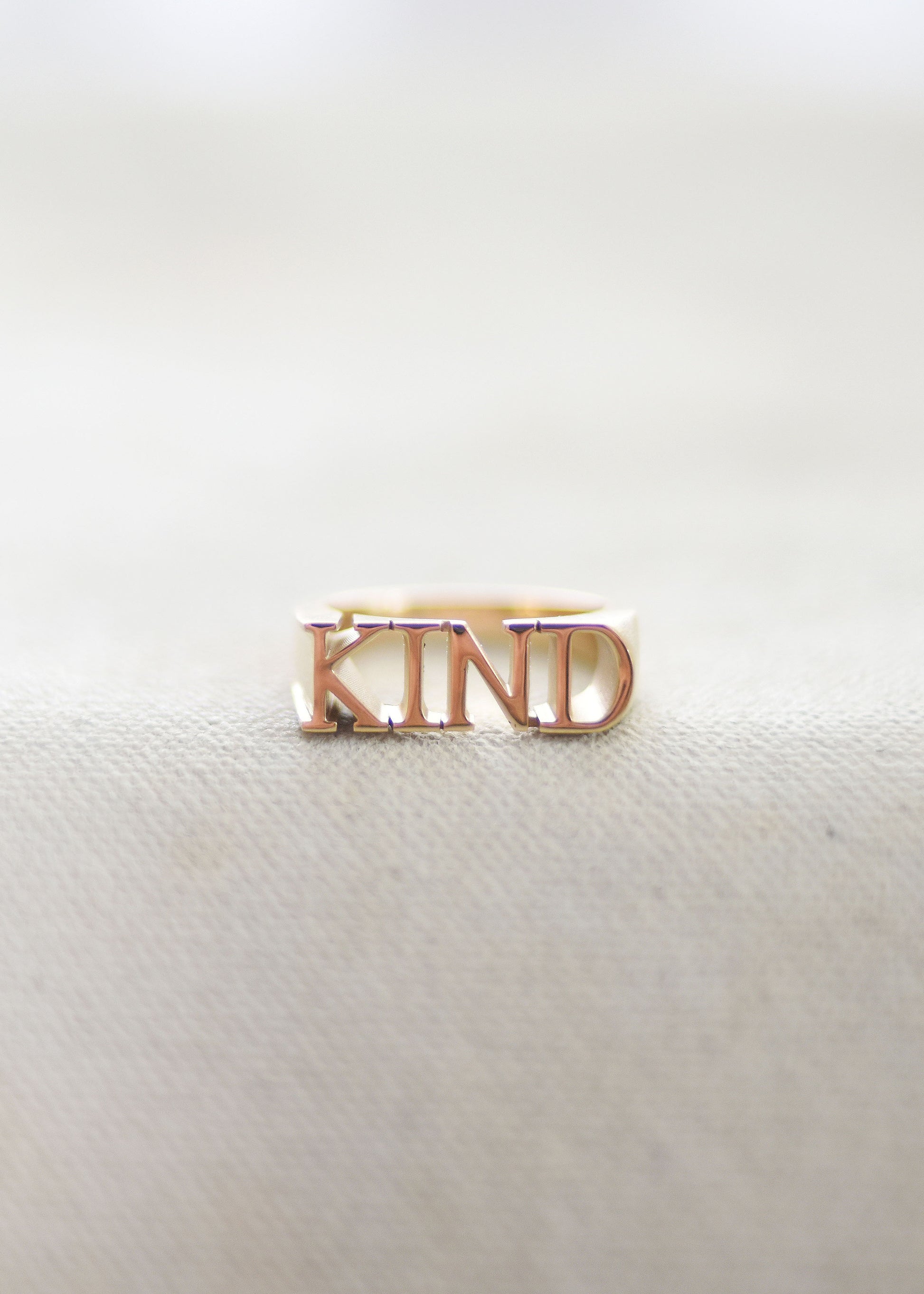 The Kind Ring is perfect on its own or mixed with one of our other saying rings. This ring is available in Sterling Silver, 14 Karat Gold, 14 Karat White Gold and 14 Karat Rose Gold.