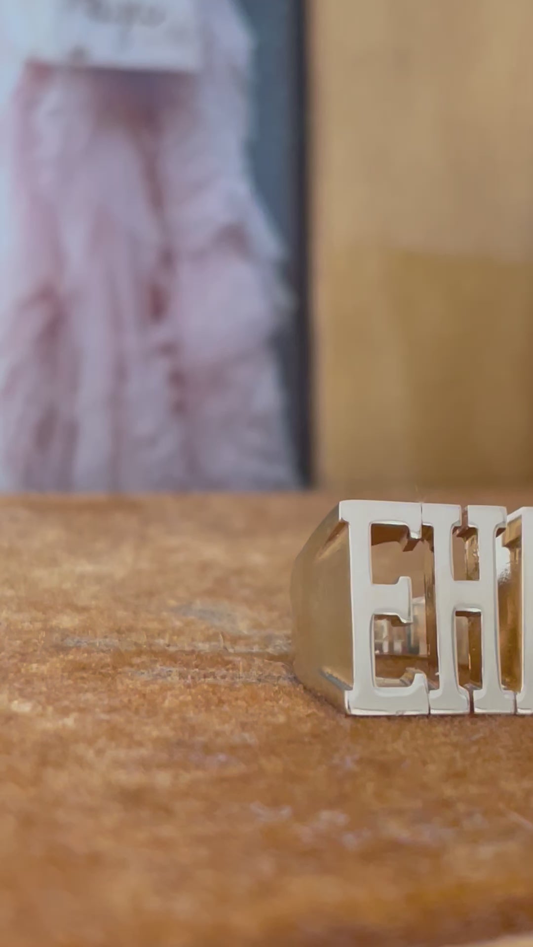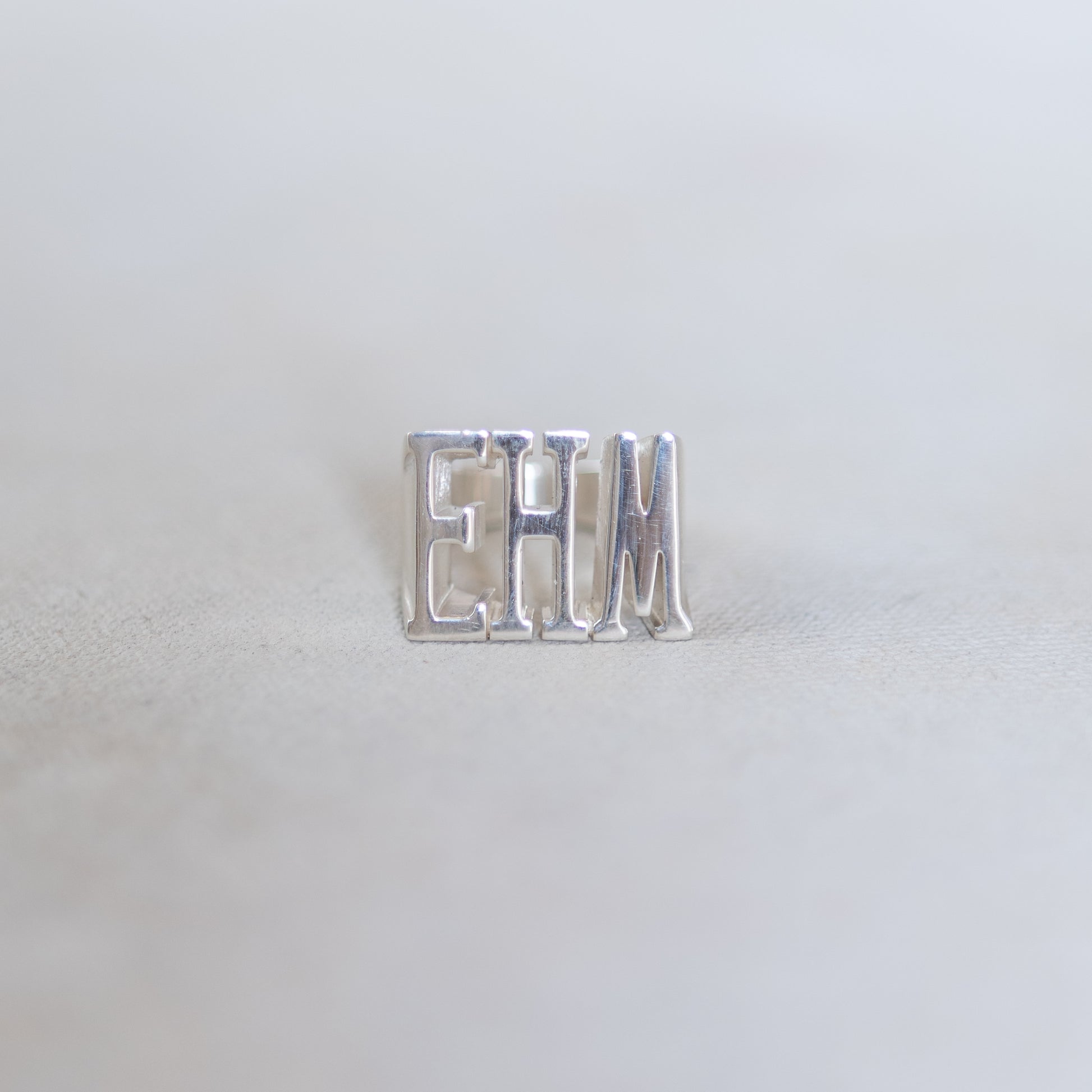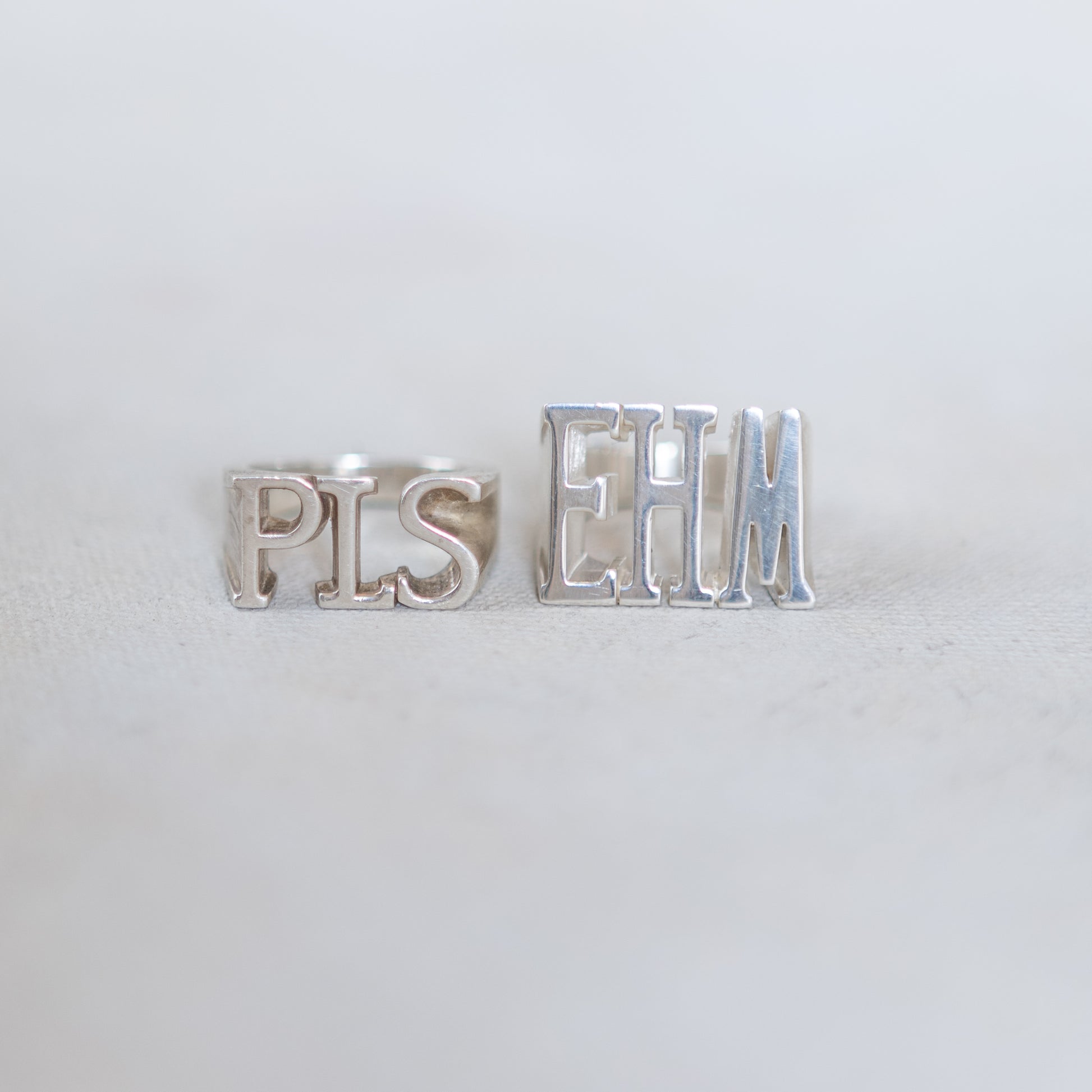 Custom at every step this initial ring involves a CAD drawing and a lost wax process. This ring is available in Sterling Silver, 14 Karat Gold, 14 Karat White Gold and 14 Karat Rose Gold. Enter your custom initials and any other requests in the box above.